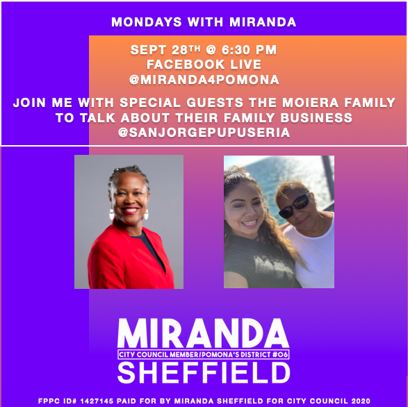 Please join me today for Monday’s with Miranda w/special guest, the Moiera Family to talk about their family business: San Jorge Pupuseria. Small businesses are essential to Pomona’s character and strength. #miranda4pomona